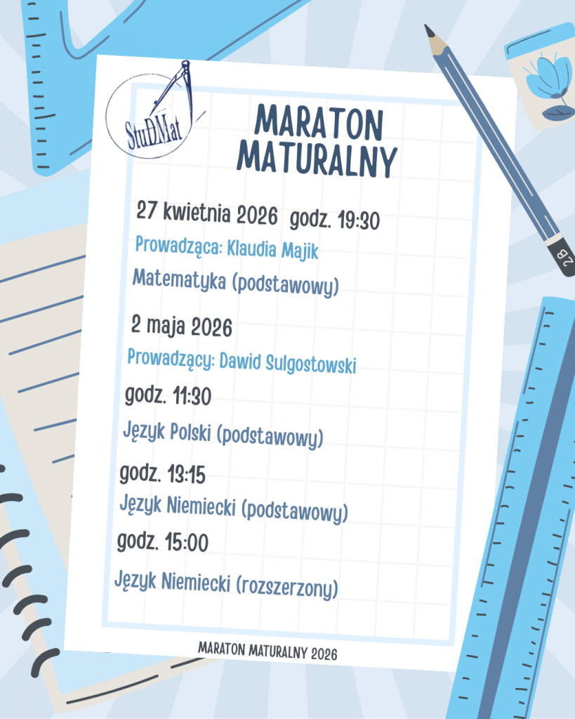 | 2 maja 2026 r. (godz. 15:00) | Język niemiecki (poziom rozszerzony) | Dawid Sulgostowski | Link do spotkania |