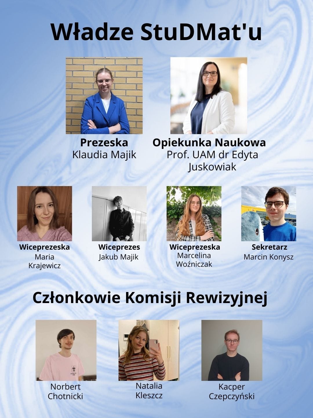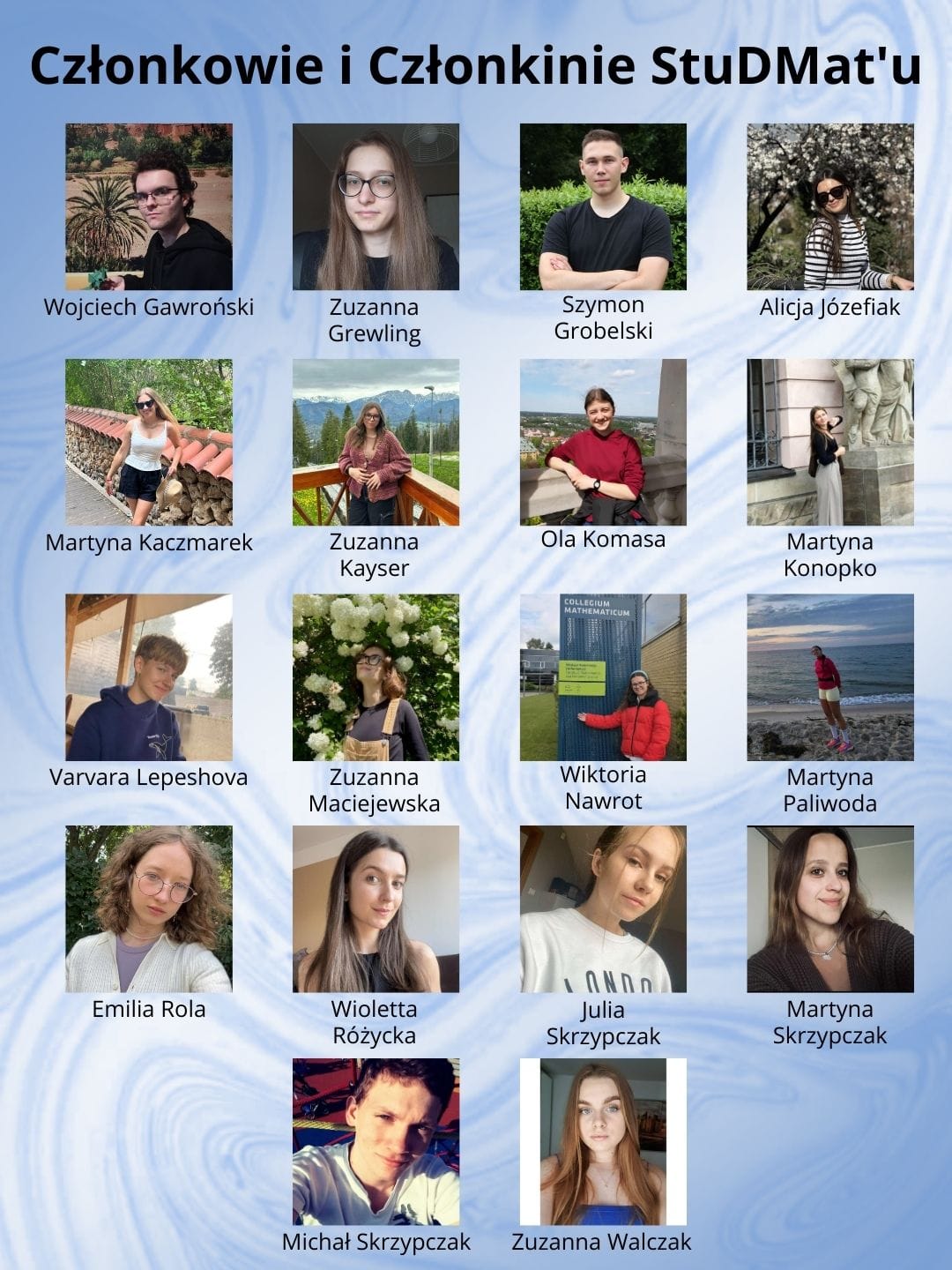 Kacper Czepczyński (członek Komisji Rewizyjnej) Siema, studiuję Matematykę, a w wolnych chwilach układam kostki Rubika. Uwielbiam rozmawiać o matematyce i Marię Krajewicz. Dołączyłem do StuDMatu, aby popularyzować Królową Nauk i pokazać, że nie jest kuciem wzorów, a może być stylem życia.